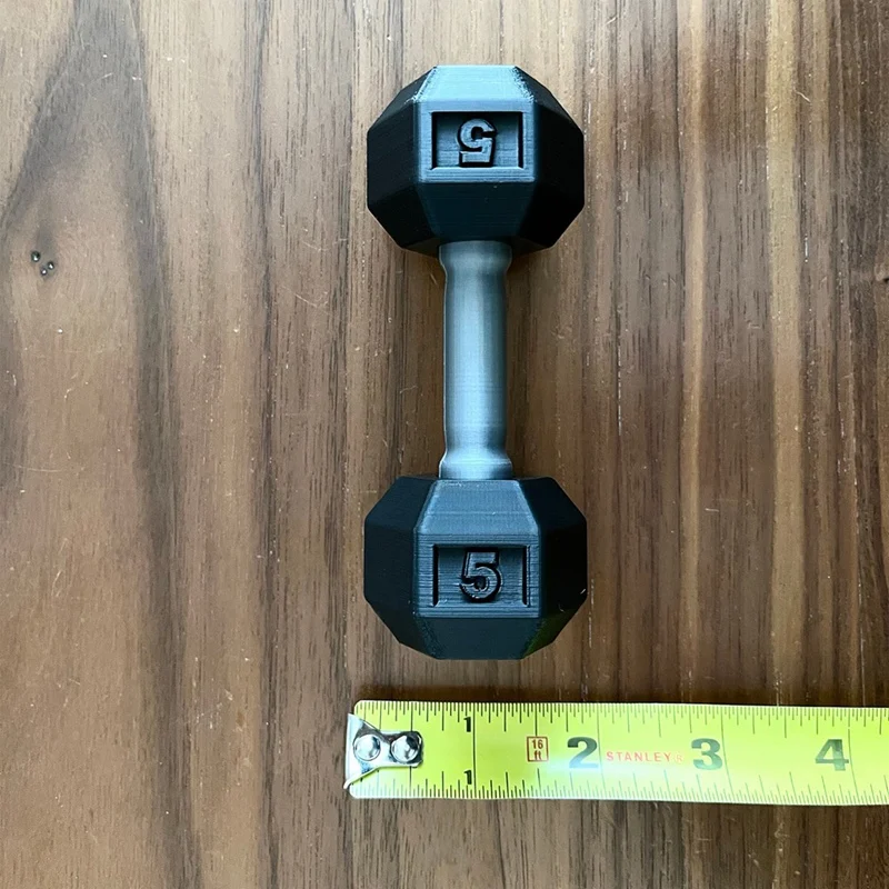 This 3D printed dumbbell is scaled down from a 15 lb weight. It is 4.5 inches in length (handhold is 2 inches), 1.75 inches in height, and 1.75 inches in width. It weighs 1 oz. For size reference, the baby holding the weights in the photo is 6 months old.
